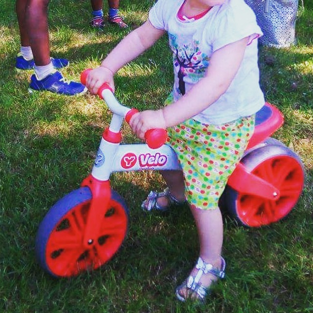 Maped a reçu une draisienne par son parrain et sa marraine pour son anniversaire : elle adore ça, et commence à bien gérer la vitesse, ralentir etc. C'est tellement mignon de la voir sur son vélo, toute fière avec son "ca'que".